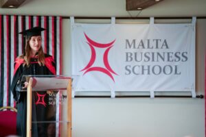 The student voice was formally represented by Kim Pace, highest achiever of the Bachelor in Business and Management programme, who delivered a heartfelt and reflective speech on behalf of the graduating cohort. She spoke openly about the challenges faced throughout the journey and the importance of stepping outside one’s comfort zone, emphasising the value of critical thinking, resilience, and mutual support. Reflecting on the role of Malta Business School, she highlighted the encouragement and guidance provided by the faculty and staff, noting that beyond academic learning, the School created a supportive environment where individuals were empowered to grow, to believe in themselves, and to become stronger both personally and professionally. Emphasising the strong sense of community formed over the course of the programme, she reminded fellow graduates that they stood “not only as graduates, but as friends”, united by shared effort and experience.