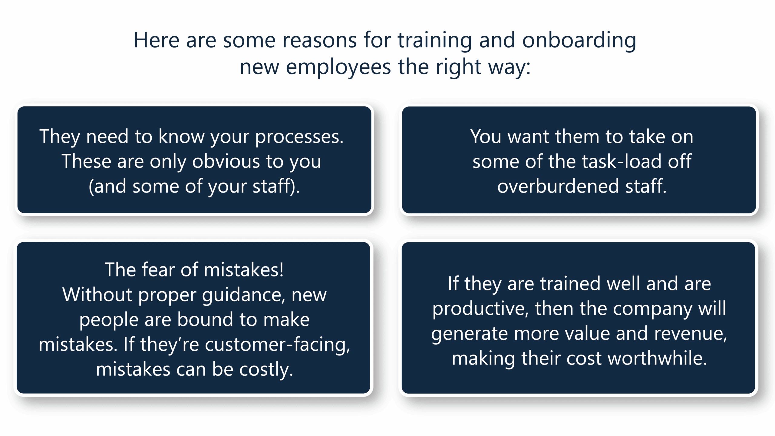 With new employees, it is unlikely that they will hit the ground running with a complete and relevant skillset. Therefore, training is essential to have a productive employee as quickly as possible, whether trained in-house (if you can spare the resources, which can be costly) or outsourced to a reputable training organisation.